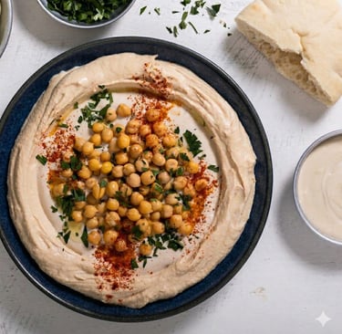 Spread the hummus on serving plates, pour the tahini generously over it, scatter the reserved chickpeas, drizzle with olive oil, sprinkle with chopped parsley and paprika, and serve with pitas on the side.