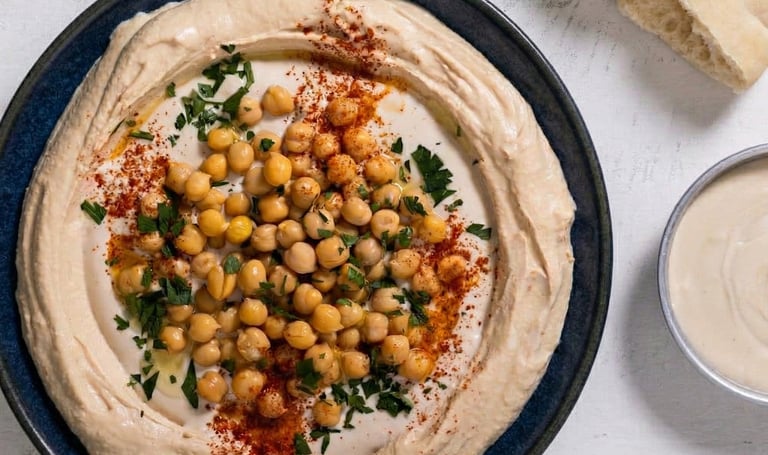 In a food processor, blend the cooked chickpeas and the tahini mixture into a uniform and creamy spread (do not wash the tahini bowl just yet). If needed, add a little water. Taste and adjust seasoning.